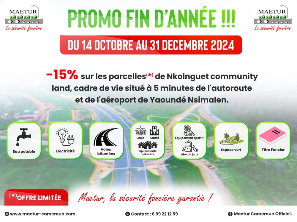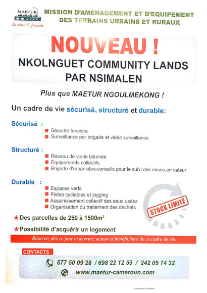 Présentation : Situé au sud de la ville de Yaoundé, à 5km de l'Aeroport de Yaoundé Nsimalen, à 20 mn du centre ville par l'autoroute Yaoundé Nsimalen. Gated squ ...